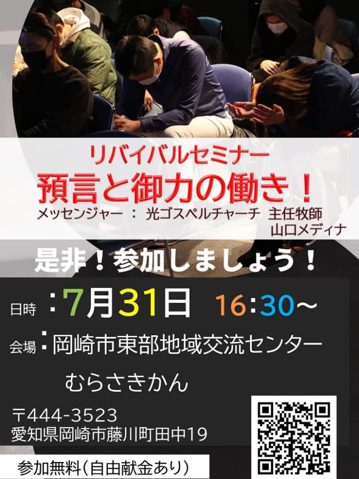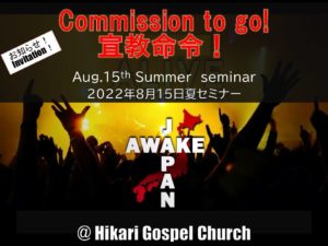 終わりの時代の教会に現わされるイエス様の預言と御力の働きを、祈り求めて行きましょう。主は求める者に応えて下さり、さらに溢れさせて下さいます。廃墟を建て直す者、この国に神様の愛を創り上げる者として、変えられて行きます。 お知らせ(News) よかったらシェアしてね! URLをコピーしました! URLをコピーしました! 関連記事 光ゴスペルチャーチ熊本2周年 2024-03-12 Awake Japan Kumamoto 第2回 2022-10-04 夏のリバイバルセミナー第2弾 2022-08-10 光ゴスペル・チャーチ熊本 2022-06-07 6月教会お知らせ/Announcement of June 2022-05-30 イースターフェスタ・パレード~ウクライナ支援チャリティー 2022-05-21 5月4日時間変更/Training season Time change 2022-05-01 ワーシップフェスタ IN 静岡 2022-04-23