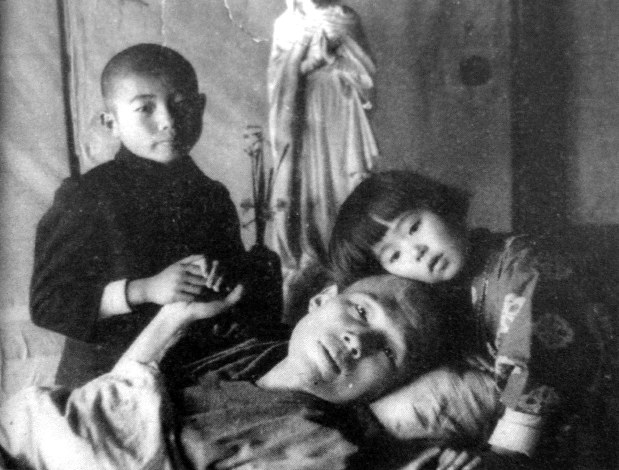 長崎市、永井先生と子供たち。母親が原爆で召された後、永井先生は子供たちに、せめて父親のにおいを教えてあげたかった。親の心。